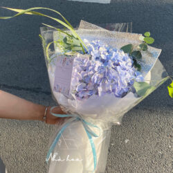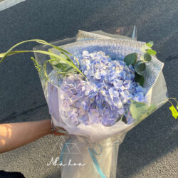 MÔ TẢ: 3 bông cẩm tú cầu mix lá phụ phối giấy vân long trắng ở trong, kraft kiếng trong bên ngoài